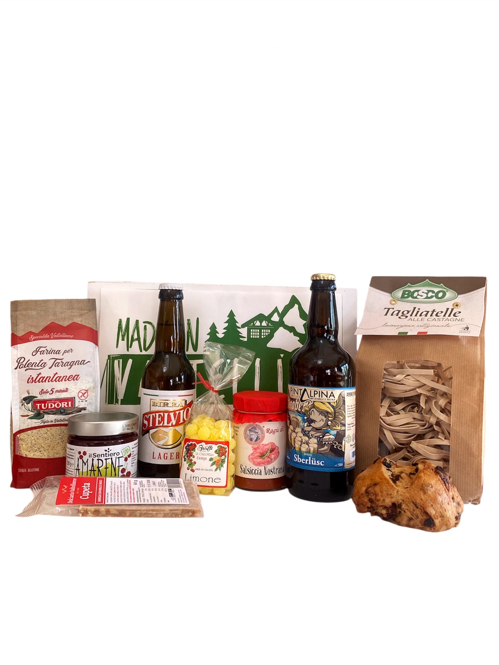 Allestito in una elegante scatola di cartone personalizzata "Made in Valtellina", la confezione include i seguenti prodotti: